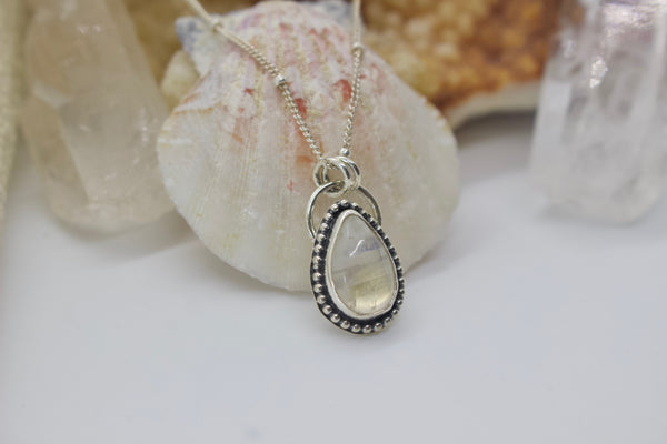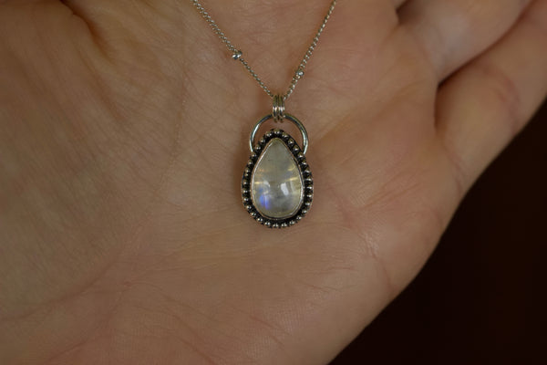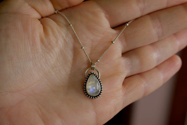 Stone: Rainbow MoonstoneChain Length: 18 inch sterling silver chainMaterials: A combination of fine and .925 sterling silver Dimensions: 18mm(L) x 11mm(W) Weight: 2.3g