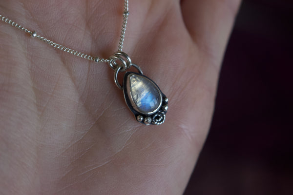 Stone: Rainbow MoonstoneChain Length: 18 inch sterling silver chainMaterials: A combination of fine and .925 sterling silver Dimensions: 14mm(L) x 9mm(W) Weight: 1.6g