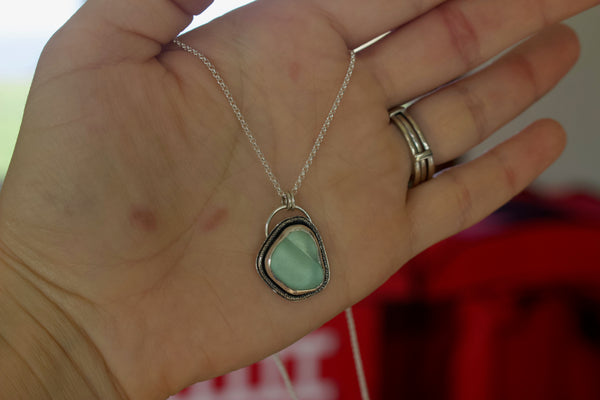 Sea Glass: Light BlueChain Length: 18 inch sterling silver chainMaterials: A combination of fine and .925 sterling silver